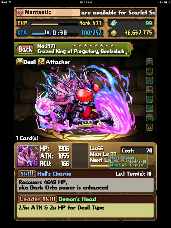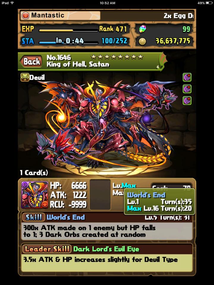 • Uses and team roles: I use Satan Satan as a speed farming dark row, devil based team and most notably for King of Gods Farming. Satan provides an amazing health pool, but you are unable to actually heal any health when matching heart orbs (can still heal via awakenings and actives). This makes his gameplay different as you have to find a balance between stalling and sweeping the floors. Luckily, there are many dark devils available and his triple row enhance can wreck modest bosses when speed farming. I pair Satan with a Lu Bu Lu Bu to bring myself to ~40k hp and many row enhance awakenings