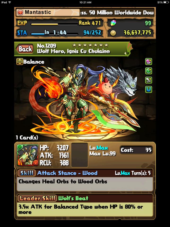 • Uses and team roles: I call him Choo Choo for some strange reason, but could be mainly because of the previous naming released early on. Regardless, Cu Chulainn Chu Chu is an amazing mono green sub but only truly shines in his Green/Red form as this evolution unlocks the TPA awakening which is immensely popular in mono green teams. The rapid access to green orbs combines with well balanced stats, makes for an excellent sub even along side REM options.