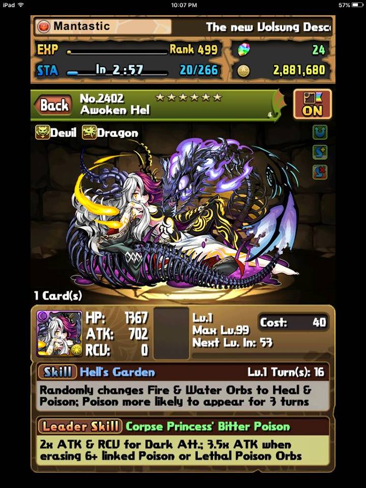 • Uses and team roles: Awoken Hel is quite the unique monster and deserves special mentioning as she is capable of forming a 49x damage lead with 4x recovery. However, you must match 6 connected poison orbs to trigger your full multiplier. This unique playstyle offers a new challenge as you must simultaneously manage your health, poison orbs, and dark orbs to deal damage. Awoken Hel is able to be max skilled to a 6-turn cooldown and between the 2 leads, you should be able to chain skyfall actives. Fun to play, but challenging to master is perhaps the best way to summarize Awoken Hel .