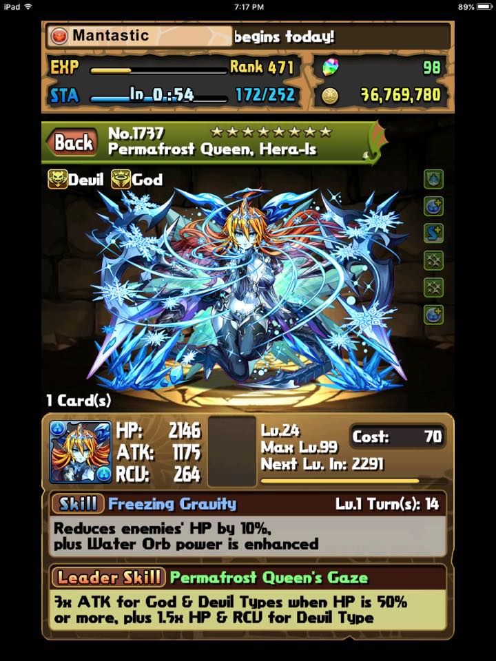 • Uses and team roles: Hera-Is was at one point a top tier sub in her Blue/Dark Hera-Is form as she filled two awkward colours on rainbow teams and gravities reigned supreme. Fast forward to today, her role as a gravity is less vital; however, with the inclusion of perseverance as a boss mechanic, her active can allow a safe kill as you can use gravity to push the boss out of their perseverance range, then match orbs to kill. In her Blue/Blue Permafrost Hera is (and prettier form) she fills the role of a mono blue enhancer should you not have a suitable REM replacement. She is able to be skilled up via the Summer Pad Event and probably need to wait a while to have access again.