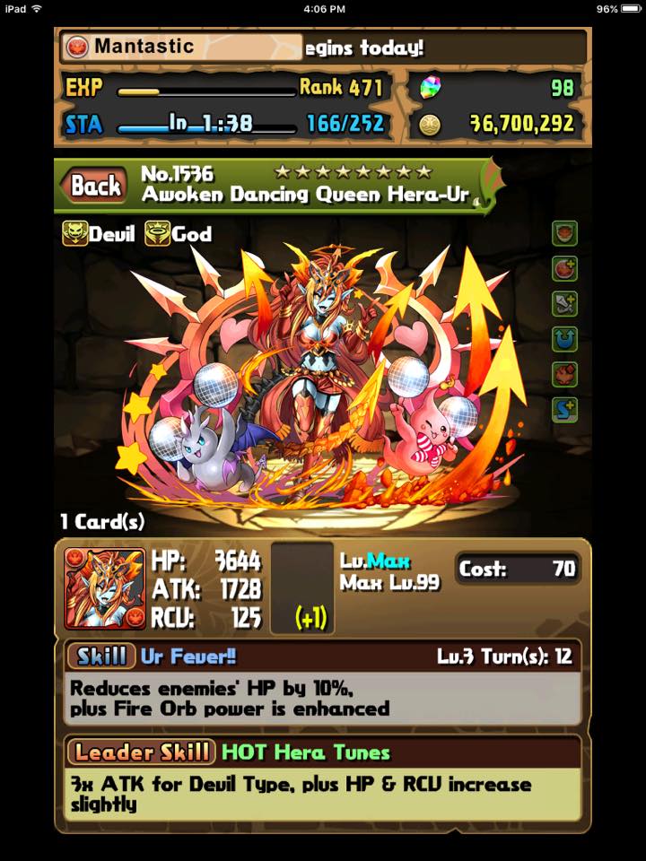 • Uses and team roles: Aside from her charm and good looks, Dancing Queen Hera fulfils the orb enhance role on mono red and devil teams. It is worth noting that her ultimate evolution only enhances red orbs instead of red and dark. If you are using a purely dark devil team and are in need of an orb enhance, her Awoken Hera-Ur Awoken Hera Ur form may be your best solution. However, in her Dancing Queen Dancing Queen Hera form, she has superior awakenings and enables red teams to burst even higher