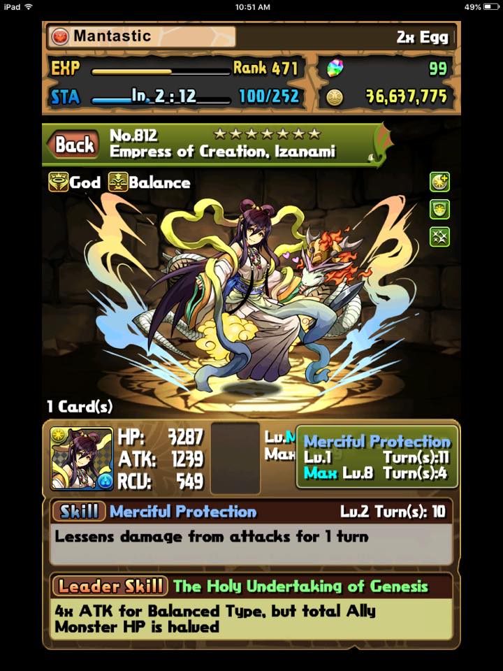 • Uses and team roles: Once regarded as a strong 9x lead for dragons, ADZ has fallen out of favour simply due to time and powercreep. However, he is still a 5 turn orb changer of red to green which is a boon to all mono green teams as well as Umisachi Yamisachi U&Y teams (who do not use red orbs). Yes I know mine is not fully evolved, but I did have one a long time ago and fed him away for the pluses once I realized Sakuya Sakuya was my dream team.