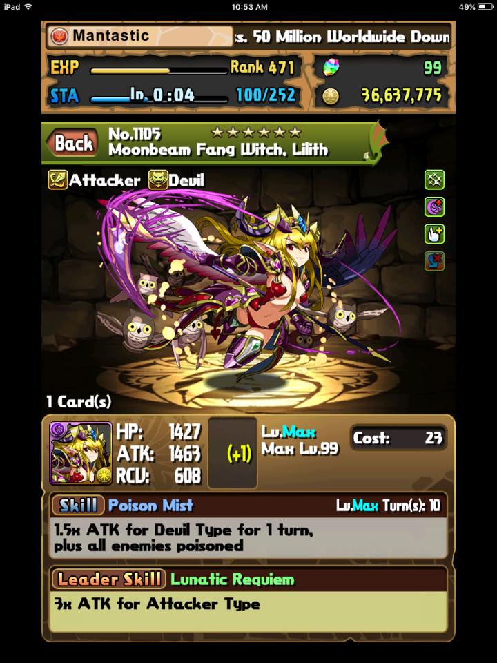 • Uses and team roles: Lilith has historically been valued for her ability to poison high defence monsters and effectively bypass their mechanic and instantly kill them. This still holds true and can be used to remove dangerous pii (coin dungeon, challenge 5), or high defense monsters in the various weekday dungeons. She also now has the benefit of providing a small 50% boost to devils for one turn and thus allowing her to double dip in her active usage. It is good to note her recovery is amazingly high for a devil and will provide a huge RCV value to any team. Lastly, you can use her poison to kill a boss with resolve (who does not have status shield).