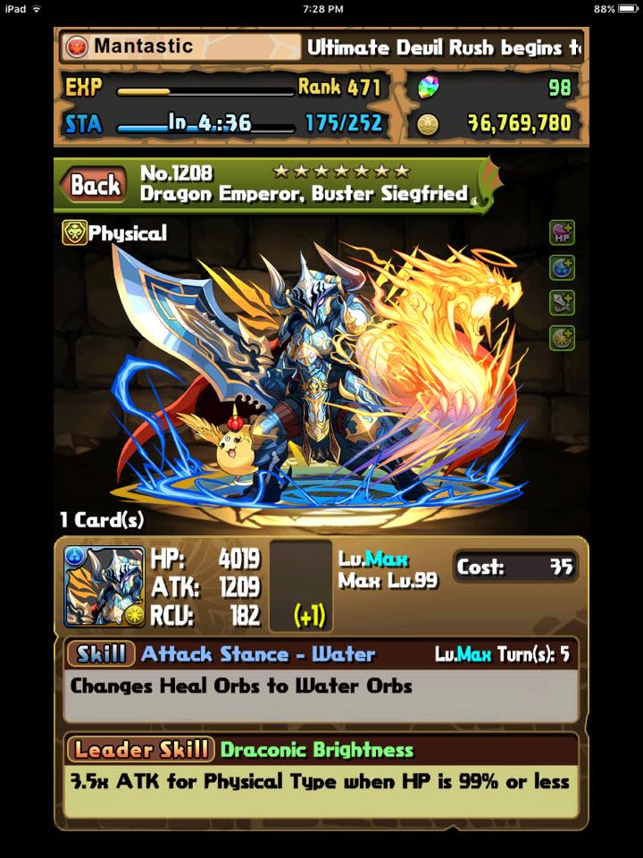 • Uses and team roles: Cyclone Devil Dragon deserved mentioning because he is a farmable devil with an orb changer. Now, it may not seem that impressive to have a simple water to dark orb conversion at a max skill of 8 turns, but Cyclone Devil Dragon does synergize with Haku Haku to produce a board 2/3 dark and 1/3 red. Even if you do not own a Haku , Cyclone Devil Dragon can still provide an orb change for devil / dark teams. Even to this day, I still use him on my King of Gods Satan Satan farming team.