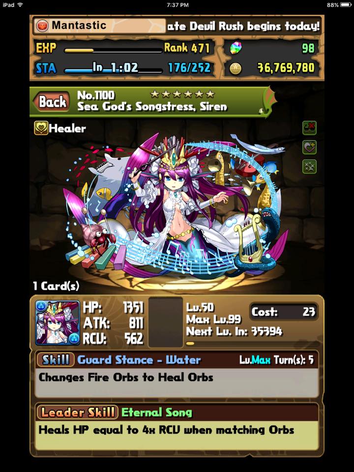 • Uses and team roles: Aside from playing fancy orchestras under the sea, Siren is one of the best (and farmable) heart makers in the game! She is very easily skilled up via the blue Marine Goblins Marine Goblin and has amazingly high recovery. You can use Siren on a team that combines bind revoery Bind Clear awakening awakenings with her active to have a makeshift bind clear through a row of hearts. Siren can also play the defensive sub role in mono or rainbow colour teams. Since her access to skill ups is so common, you can have one max skilled very early on and be able to stall on bosses longer due to frequent heart generation and high recovery