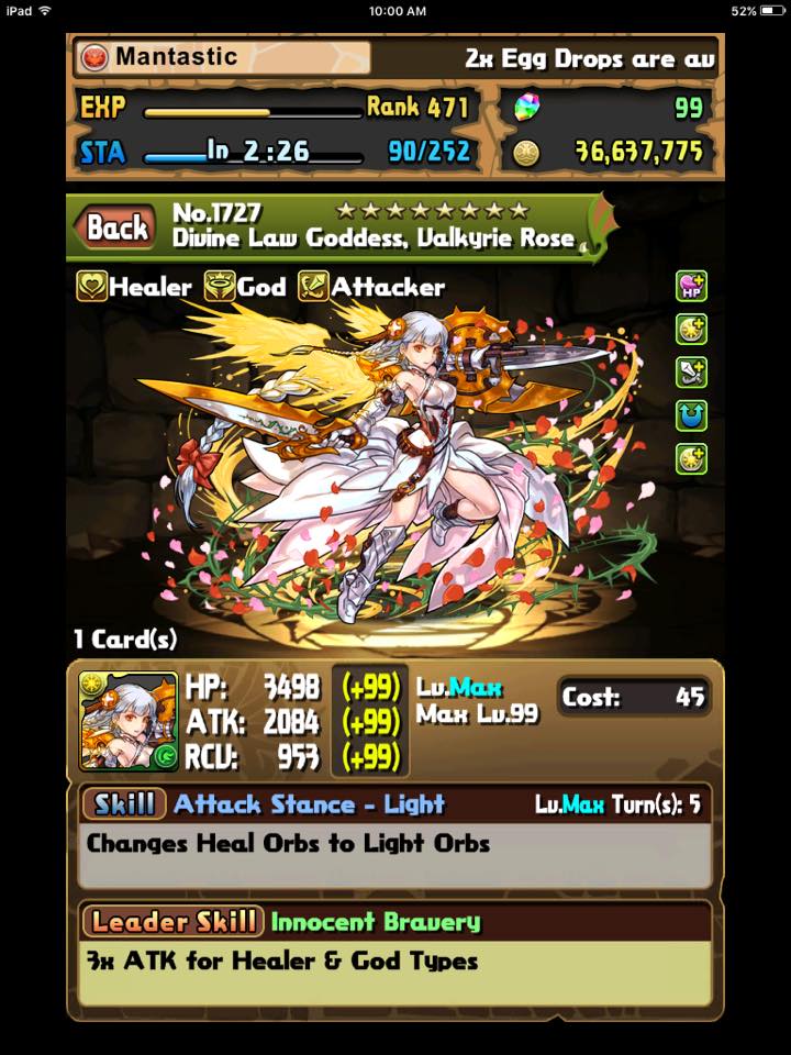 • Uses and team roles: Eye Candy aside, Valkyrie valkpad fills the green slot on rainbow teams as well as being a powerhouse on the light primary rainbow teams. The fact she can be skilled up to 5 turns as well as providing the main damage orb makes her almost irreplaceable. Perhaps I am biased as she was my second hyper max and has an almost guaranteed spot on my Sakuya Sakuya and Light Kali Kali teams. Awakenings are quite strong for a farmable monster as the two prong attack TPA and double light orb enhance +light orb awakenings pushes your damage when combined with at least 3 other +light orb awakenings because it guarentees all light orbs will spawn with a plus and adds +50% more damage for all light monsters. I could probably ramble on more about my love for Valkyrie, but I should restrain and make her own post at a later date =) TLDR, if you own a rainbow or light team get her!