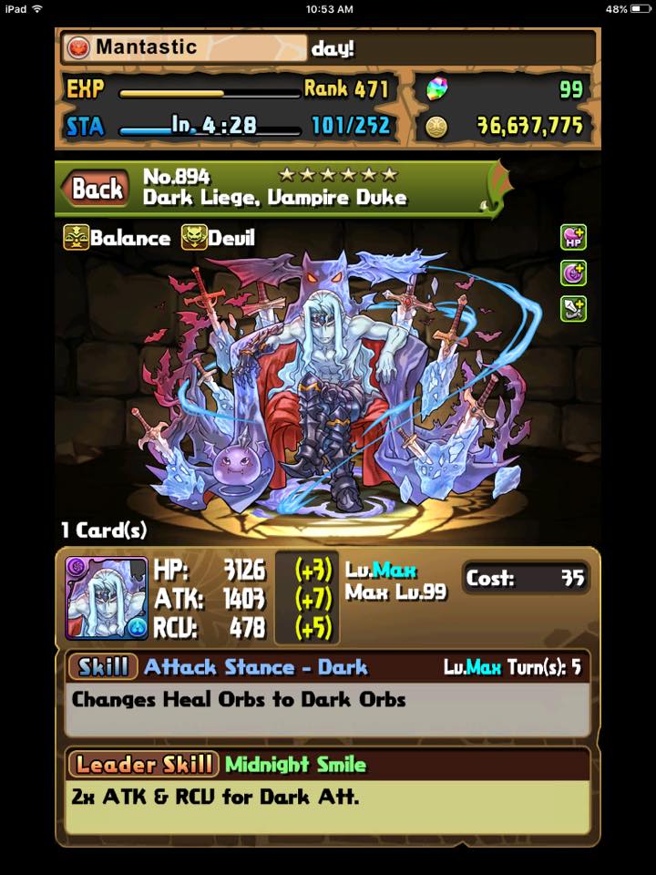 • Uses and team roles: Vampire is the dark equivalent of Valkyrie valkpad with inferior awakenings and stats. Vampire has an amazingly powerful 5 turn heart to  dark orb change which is easy to skill up. The biggest drawback compared to valkpad is he only comes with 3 awakenings. But nevertheless, Vampire can play a central role in dark based teams as the quick access to dark orbs can allow you to pump out constant damage. He also has quite balanced stats and a large amount of recovery for devils.