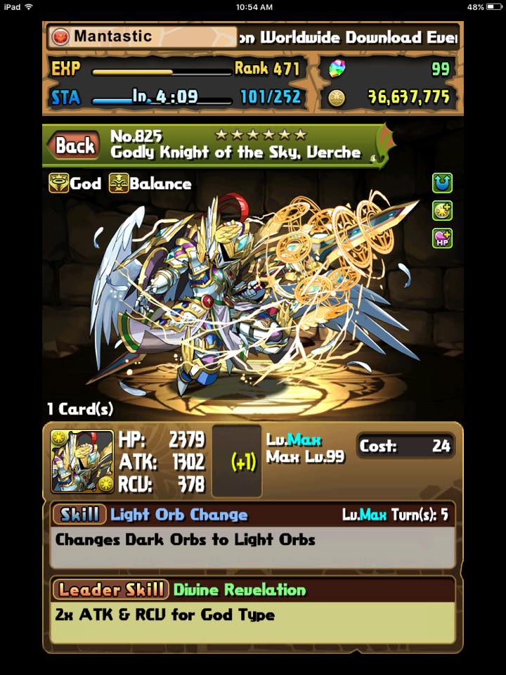 • Uses and team roles: Verche functions as a fantastic 5 turn orb changer and removes those pesky dark orbs for Sakuya Sakuya teams. As a sub in mono light / god (Athena Athena) teams, Verche acts as a quick and easy orb changer who also has a TPA awakening. I used him extensively in my early Sakuya days and still use him on my Athena team to make runs go faster.