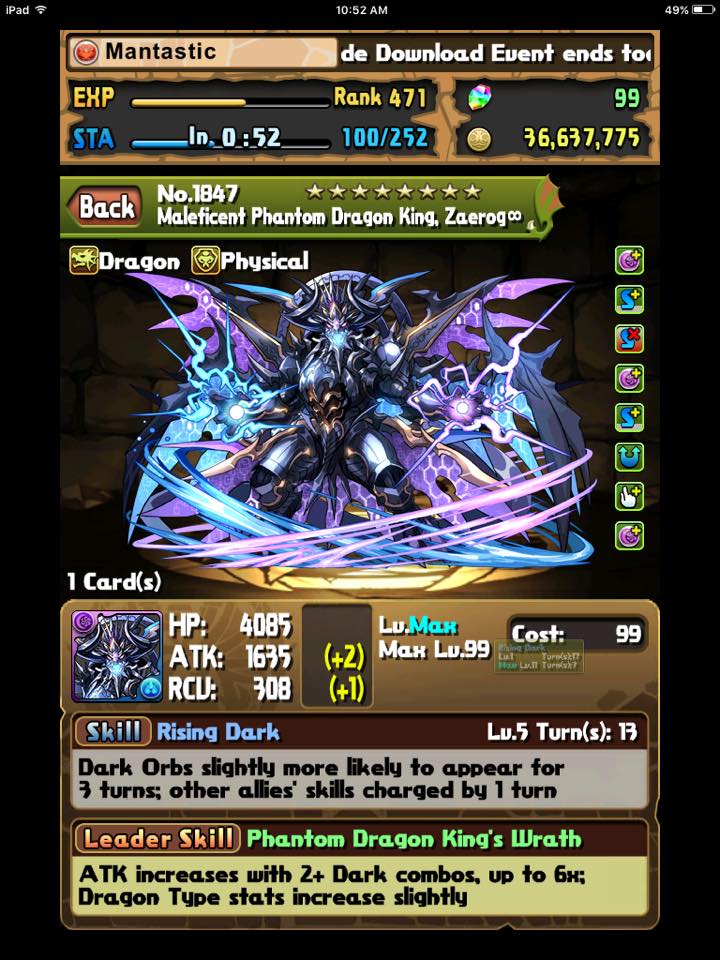 • Uses and team roles: Aside from the pure trophy aspect, Z8 is a top tier lead and sub once max-skilled. However, farming for skill ups can be quite challenging as the dungeon is difficult to clear and requires 10 successful skill ups. The power of enhanced skyfalls, enhanced dark orbs Dark Orb Enhance , and haste result in a fantastic active overall. Some mono dark or combo teams may like to have 2 max skilled Z8 to have a permanent skyfall buff, but that alone is an obscene investment. If you have the capacity to clear and skill him up, Z8 will become a dream monster to have.
