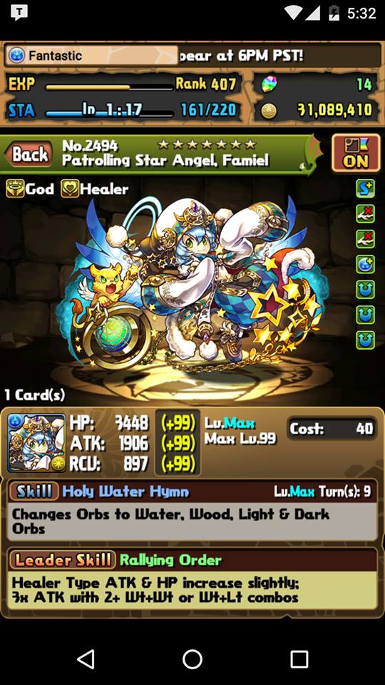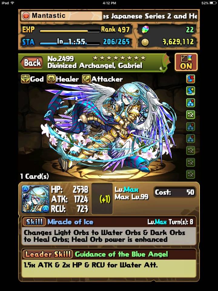 Gabriel has a strange place in my PAD heart as he was my first REM god roll (after starting with countless 3 and 4 star monsters) and still has yet to be used. However, after receiving an ultimate of an ultimate evolution and being bolstered a total of 3 water row enhance