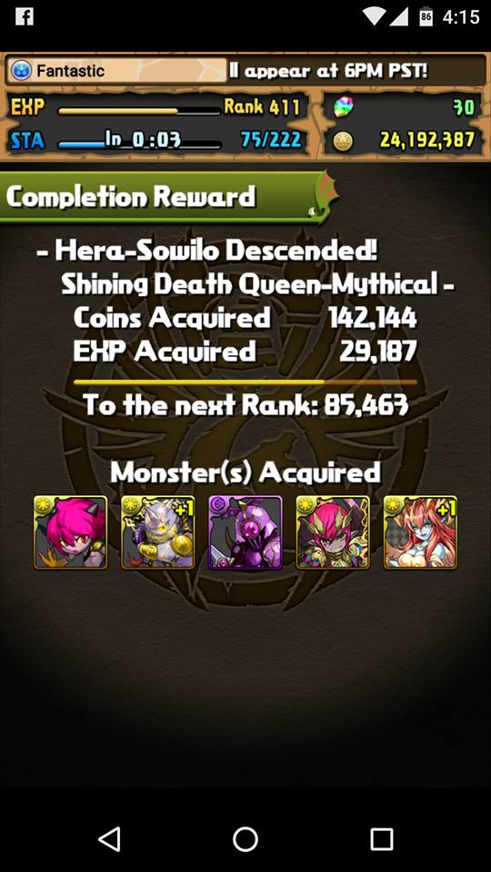 The coin version of Hera-Sowilo has both legendary and mythical difficulties and will also grant a stone upon first completion. The purchasable descends are also affected by the 5x drop rates so they can be a nice alternative to the daily featured descend. Hera-Sowilo is regarded as one of the best descends to play during 10x or 5x as you can have up to 9 egg drops per run (the most I have ever gotten is 7, but in theory 9 can happen) thus making it one of the most stamina efficient methods. Furthermore, the descend is not too difficult as it has no dangerous preemptives, resolves, and the final boss gives your plenty of turns to kill. If I have nothing to do on a particular day, I plan on running this dungeon repeatedly as I can expect a couple of plus eggs per run as well as a hefty amount of gold and rank experience. However, come February 1st, the coin dungeons will rotate again and we will be left with The Goddess Descended which can drop up to 4 plus eggs. I might switch over to normal dungeon farming when this occurs or systematically go through the challenge dungeons.