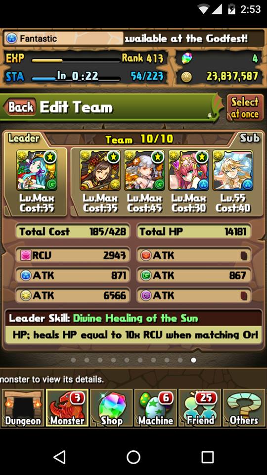 has 40 health (600k defense) along with hitting for 13660 damage every turn. With my 41k health pool, I am able to take several hits without healing should my board never produce a heart orb. One reason why teams with augmented health pools flourish for these farming session is that the