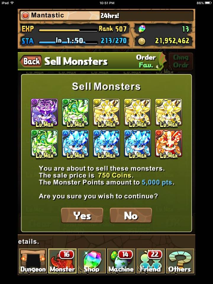 The result of 11x 50 stamina and a single 99 stamina run. Thus, 650 stamina yielded me 5,200 MP (the baby PreDras were sold to show the highlights) for the price of 2 refills and some natural stamina. I was also quite fortunate in the number (albeit excessive 5 fire) 1% resist Tamadras. Overall a much more efficient method of MP farming provided you have at least 125 stamina and plan to refill as to benefit from overflow. 2 stones would yield 5 runs and 433*5 = 2,165 MP and this outweighs the 1,000 per stone spent at the REM.
