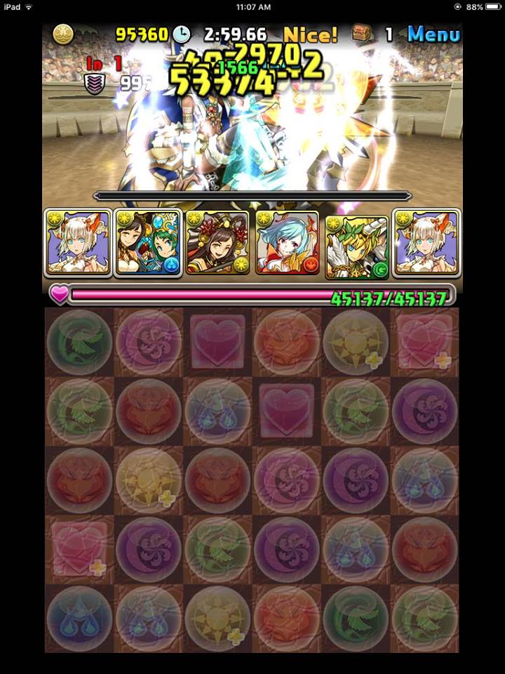 The amazing thing about Myr teams is you have effectively 4x the listed HP (and RCV/auto healing) when you form a heart cross. I actually tank Ilsix’s enrage attack when under 30% HP to conserve actives as I effectively have 191k+ health. Hera Dragon is very scary as she absorbs over 2 million damage and has 39 million HP (The Radar Dragons are much scarier than the Kalis). Furthermore, she will alternate hitting you for 86k+ damage and restoring you to full health. You eventually die as the damage becomes too overwhelming so it essentially becomes a race against the clock. Due to the fact she is dark, I have to deal under 1 million damage to prevent her healing. This can be done via a heart cross and 2 light combos or a single TPA (on Fantastic, Mantastic’s Apollo will hit too hard). I had a surprise light TPA skyfall on turn 4 which gave me a major heart attack.