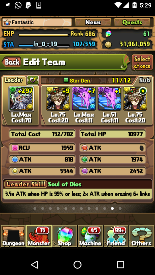 However, with the introduction of the +9 PEM, we now have an even more efficient medium for farming plus eggs provided you have numerous Best Friends. Every time you use a Best Friend, you will receive 100 Pal Points and each spin costs 500. This means you can enter the 2 stamina dungeons (in the Normal dungeon section) and simply quit to save time. This results in a 10 stamina cost to acquire 9 plus eggs. Granted you lose out on the small rank experience from Star Den, but it was insignificant to begin with. The entering and quitting process does take up more time than a Star Den button team, but it is significantly more stamina efficient.