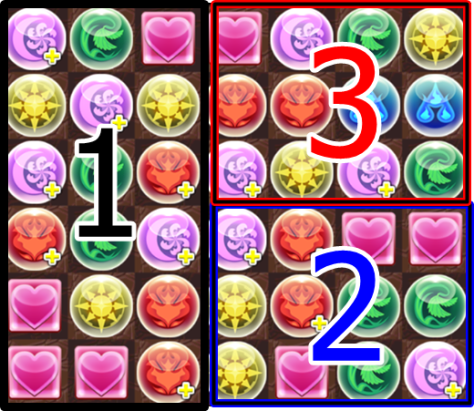 Essentially, you wish to form section 1’s two horizontal rows on either the top or bottom and then create section 2 in a vertical manner. This is because it is far easier to manipulate orbs when you have at least 3 space in each direction. If section 2 was done horizontally, the first combo would be easy to match as you have 3 spaces, but the second and third will be come exceptionally challenging as you are no longer able to manipulate orbs in a vertical manner as easily.