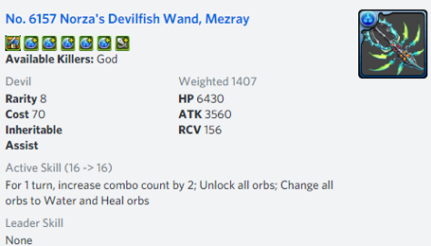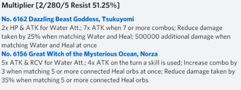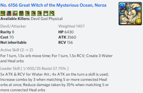 While all of this sounds appealing, the biggest hurdle will be team building as Norza requires an active skill being used every single turn. Naturally, 2 Norzas are the best solution as she will generate 3 Water and Heart orbs to always activate and if you had 2 Hearts from before, you will enjoy the +3 combos and additional Damage Reduction.