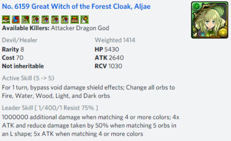 will result in 16x personal damage against any spawn when hitting 7 or more combos. This is relatively easy to do, even with Aljae’s Leader Skill requiring one matched 5. This is because an average board will have 7-8 combos and there is a strong likelihood one of those combos will be a set of 5 which can be blobbed with no loss in combo count.