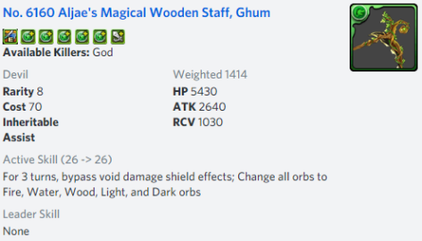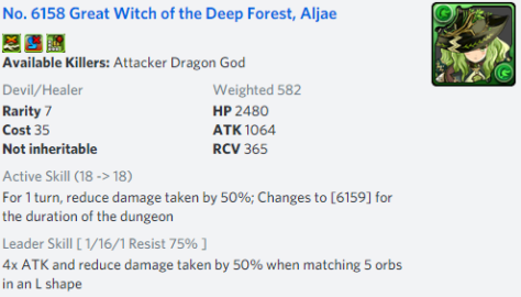 I’d run Aljae as a Chakeol sub. Team has ample VDP and doesn’t need more anti-void, but the x16 decent stats body is welcome enough, and you just inherit some Godzilla stomp board change active like zela or menoa on top and play as an inherited ability slot. (I’d also run Aljae as a lead of course, just saying she slots in to a few teams.). If you have a tricked out luxury subs Chakeol team, with stuff like x3 rcv vraska equip, team has survival pilot you with chakeols anti-bind / orb freeing effects, and damage is solid, so I could see running either as leads, but I might bias mildly to Chakeol with Aljae sub, versus Aljae with Chakeol sub, as you will be heart orb trolled on Aljae leads at some point.
