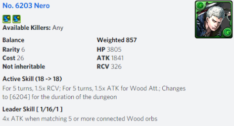 Nero is the third card within the Devil May Cry Collab and features a similar Leader Skill to the other 6-star cards from a multipliers point of view. Thankfully, Nero can self activate on a regular basis as he features a 1 turn cooldown that also produces 2 Wood orbs. This fulfills the active skill clause and provides 2/5 of the orbs needed to fully activate. As a whole, this is a reasonably easy to activate Leader Skill but the main issue is a lack of an ideal asymmetrical pairing.