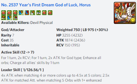 New Year Horus is now able to provide a 2x buff to ATK and RCV along with his single turn of Haste and Orb Enhance. This is a significant upgrade along with his ability to bring 4 Skill Boosts.