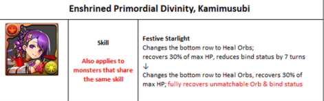 Shiva Dragon has received a significant upgrade to their active skill as they can now fully remove all Awoken Binds. This is on top of their ability to bring 6 Effective Skill Boosts and modest orb generation which in turn helps them function on Fire Transforming teams as his active will have value later on in the dungeon.
