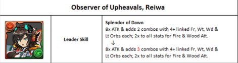 Reiwa is a farmable Descend monster and this buff grants her an additional combo when achieving her leader skill. For the most part, Reiwa is a fun to use leader that is heavily motivated to match 4 or more connected Fire, Water, Wood, and Light orbs at the same time. Being force to “blob” your combos will result in a lower combo count which is in turn offset by her Leader Skill.