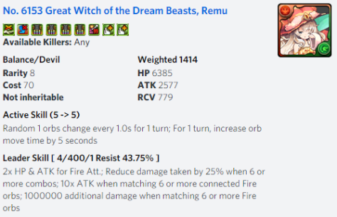 Remu is the newest Godfest Exclusive to come to North America and together with Dante , are able to form a tremendous team with 3x HP / 390x ATK / 1.5x RCV / 43.75% Damage Reduction along with Auto Follow Up Attack and +2 Combos when matching 6 or more Fire orbs.