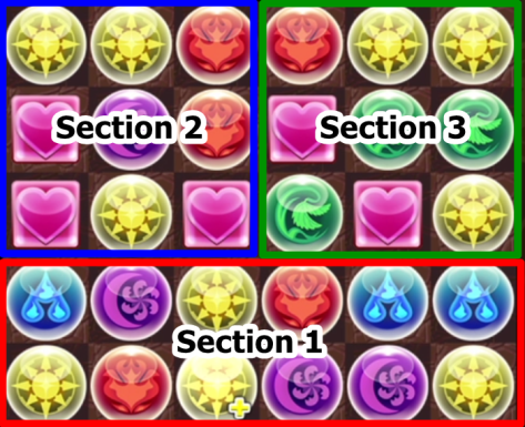 In my head, I assign three different sections to every board in order to better plan out my matches. I use Section 1 for four horizontal combos and Section 2 for three vertical combos. This leaves Section 3 with a 3×3 box for my remaining orbs which can be rearranged as required.