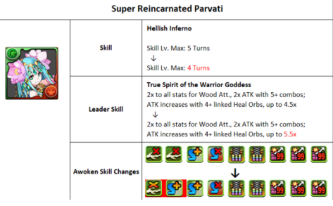 Parvati boasts large Leader Skill multipliers but suffers from a lack of Damage Reduction, bonus combos, or Auto Follow Up. Furthermore, their play style will be heavily geared towards blobbing which in turn drastically lowers combo count.