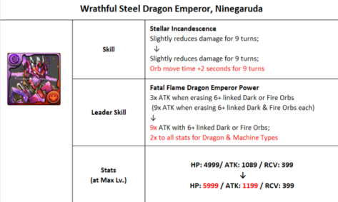 Ninegaruda can provide 9 turns of 15% Damage Reduction and +2 seconds of orb movement time but I still struggle to find a use for them as their Leader Skill is still nothing impressive.