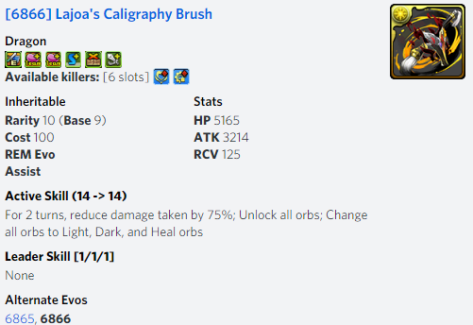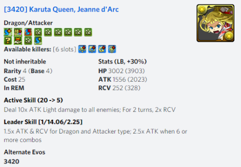With that being said, Lajoa can function as an interesting leader as they require 2 Dark and 2 Light combos for optimal performance. Matching all of these will grant +2 combos with a single leader and Auto Follow Up along with their full ATK multiplier at 8 combos. Players can help facilitate this with their 3 turn active that generates Light & Dark orbs while also producing Hazard Skyfall.