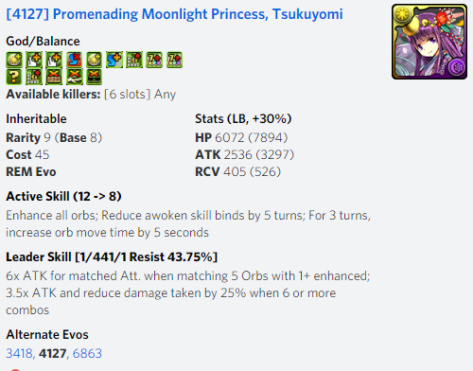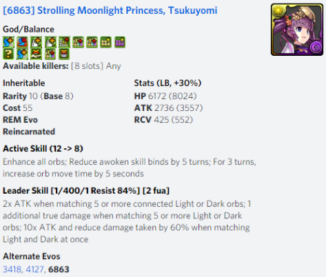 As for Tsukuyomi, I really like to run a Light/Dark Team with her as the Leader because of her Leader Skill of 1 fixed damage when attack with Light and Dark at the same time. Or Maybe make a Water/Dark/Light Team because I’ve recently finished the Haku Story and evolved her and can make her as Sub Leader while making Tsukuyomi as the Leader.
