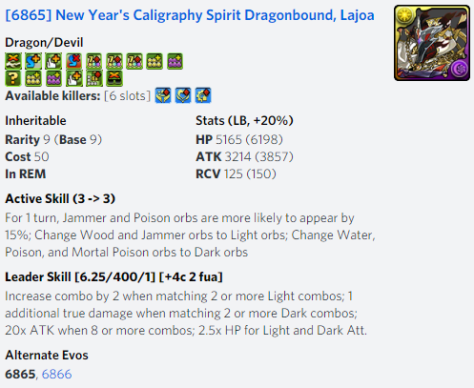 I was VERY lucky to get 2 NY Reeche last year when this came out and I’m looking forward in getting Tsukuyomi as well because of her new revo. I’m not very confident in Lajoa because of his Active Skill of bringing down Jammers and Poison for 1 turn. But I have strong Light/Dark monsters that I can use to avoid using his skill such as Mega Dark Metatron.