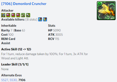 Seregios’s active skill provides 9 turns of +1 combo and 30% Damage Reduction on a 10 turn cooldown. This can be a unique way to add in additional bulk but at the same time, takes up an entire active skill along with their awakenings being somewhat middling overall.