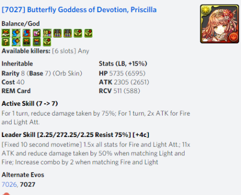 Priscilla’s Evolved form features outstanding personal damage against God spawns when matching a VDP