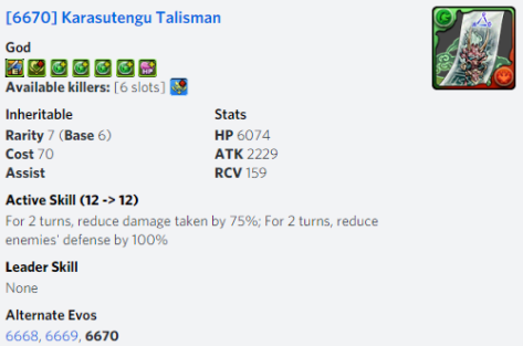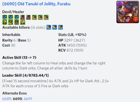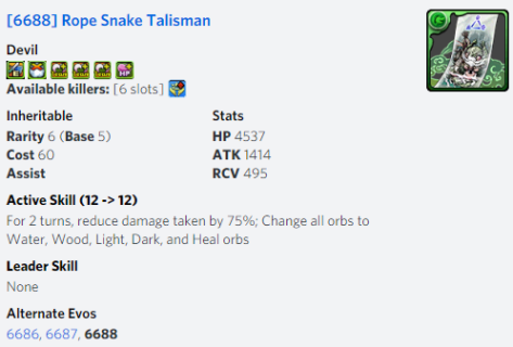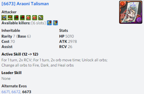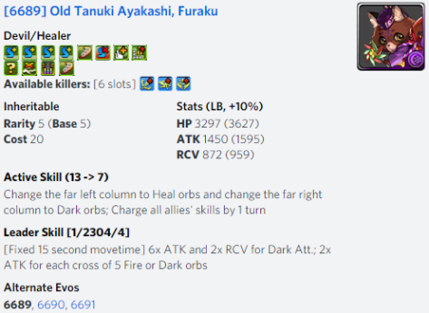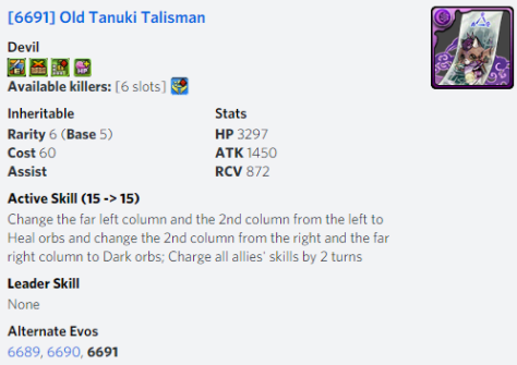 along with an active skill that can produce a column of Heart and Dark orbs along with a single turn of Haste on a 7 turn cooldown.