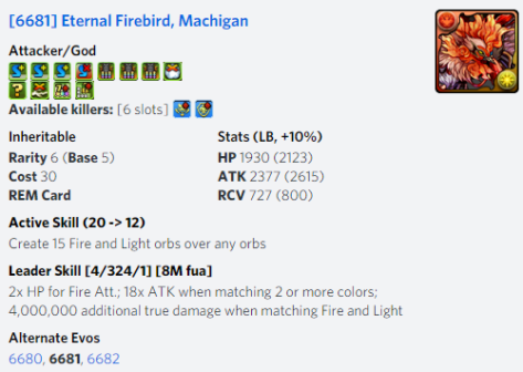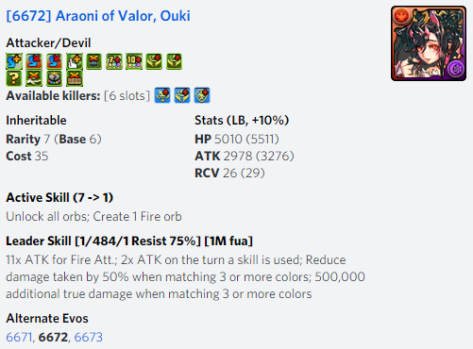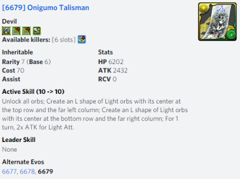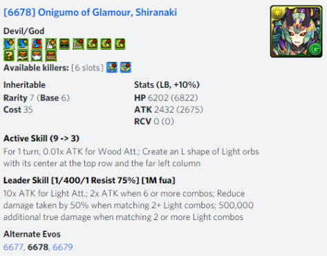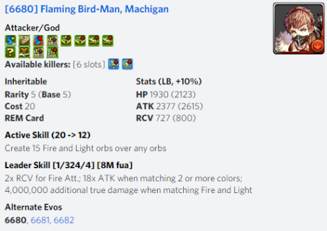 On the other hand, both forms have received a buff to their Leader Skill to include a massive 4 million Auto Follow Up when matching Fire and Light. This can be used to overcome low HP spawns with Absorbs but this will still be a mediocre leader skill overall.
