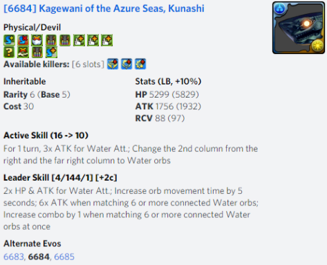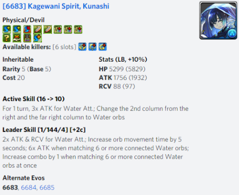 Kunashi’s evolved form shares the same active skill but does not provide enough value as a sub and will have more value as a Weapon Assist.