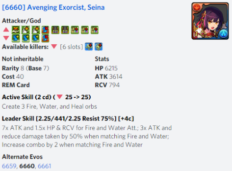 For now, Seina remains the strongest leader in NA. Come World of Carnage 3, and she turns into the worst of the three Mystics 7-stars. Seina teams have huge difficulty dealing with a certain Water spawn in WoC/Shura 3, and most of the Seina teams in JP that are capable of clearing it rely on Magneto, and we pretty much have a 0% chance of getting the Marvel collab (because FUCK DISNEY).