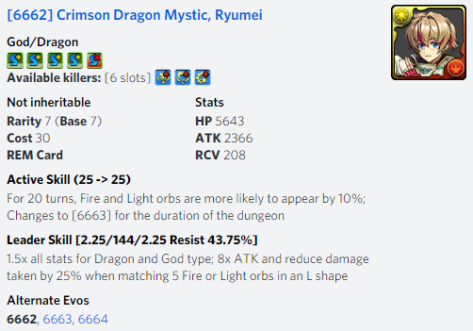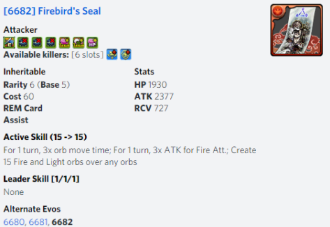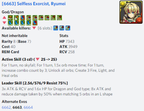Building upon this, Ryumei’s active skill is magically overturned as it Unlocks the board, produces 3 Fire, Light, and Heart orbs, 1.5x Movement Time, +3 combos, and No Skyfalls on a blisteringly fast 3-turn cooldown. This means it can be System-ed if you have a sub Ryumei but even having 2/3 up time is pretty magical and will facilitate easier and faster clear.