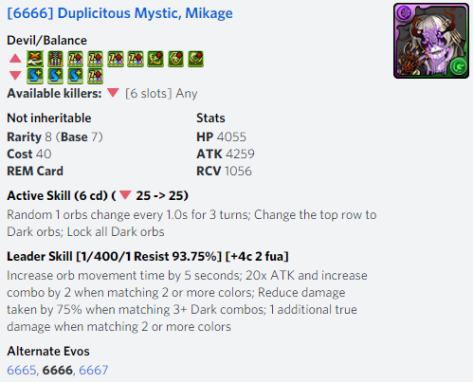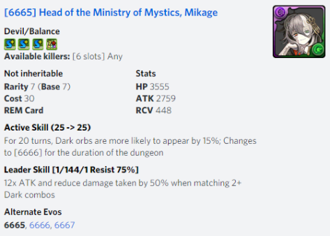 All in all, Mikage is one of the best leaders in the game due to his 16x Effective HP when matching 3 Dark combos which makes him somewhat immortal if you have a reliable steam of Dark orbs.