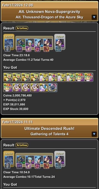 The same team blindly entered and cleared Alt. UN2, Gathering of Talents 4, and the Demon Title Challenge (three dungeons with wildly different encounters). No team was truly optimized for the respective dungeon but the team has solutions for the vast majority of problems: