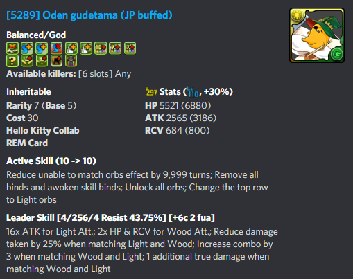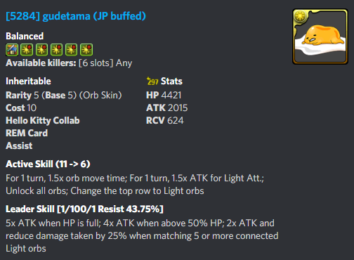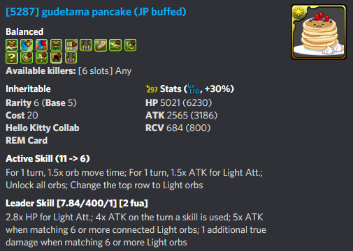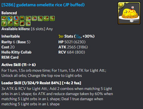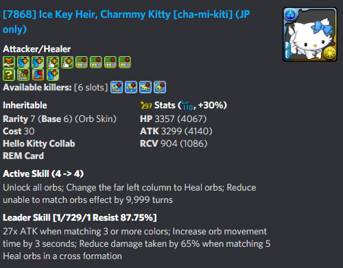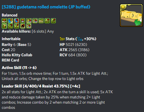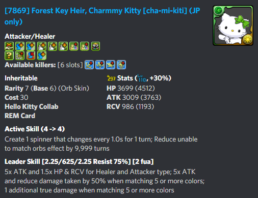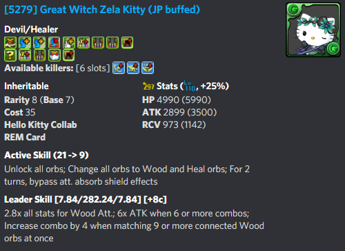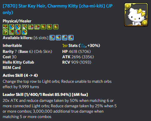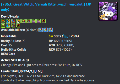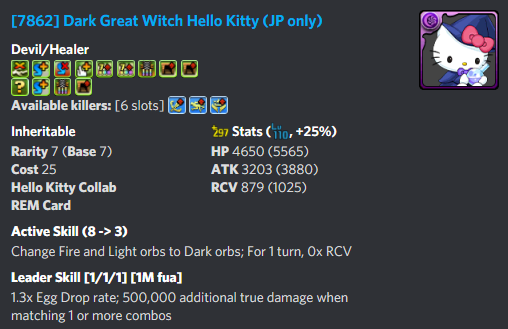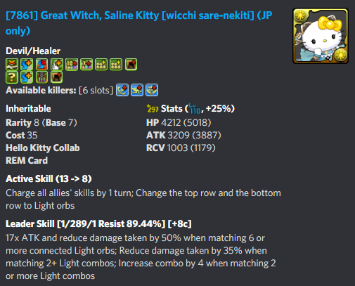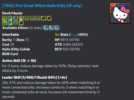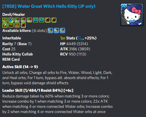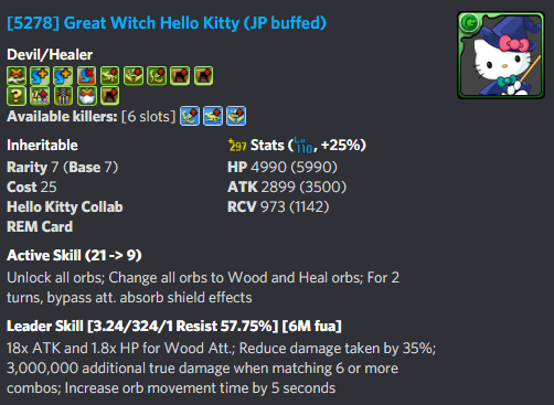 Great Witch Hello Kitty received some interesting buffs, boasting an extra SB (now four total) and 3 dungeon boost awakenings. With a lowish cooldown on her active skill, she could be a powerful sub for button farming teams; she could replace Greed Dragon, who is a common sub found on farming teams, as he only has 2 SB and the cool down on his active skill is much longer. She also edges out Xmas Saline, who has a similar amount of dungeon boosts but a much longer cooldown. Great Witch Hello Kitty is hands-down one of the more desirable cards in the collab.
