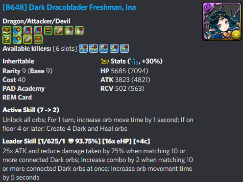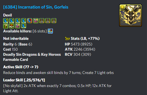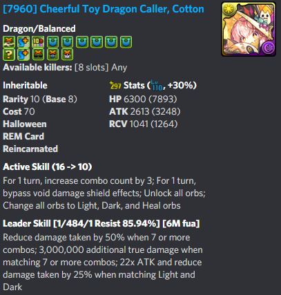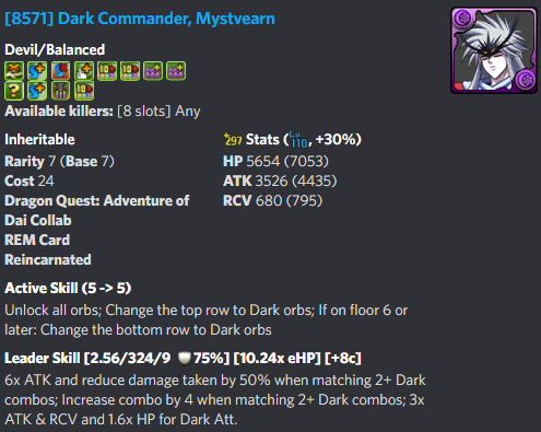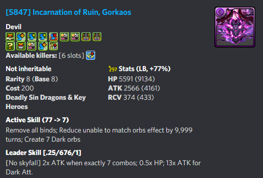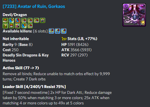 The other is an unbindable, and below eighty percent, and a Combo-Orb. The active skill is the exact same as the base monster. This means you have a very low cooldown VDP active skill that generates dark orbs, that alone would be enough utility for this to see some amount of use, but add on that it makes them unbindable, and it is even stronger.