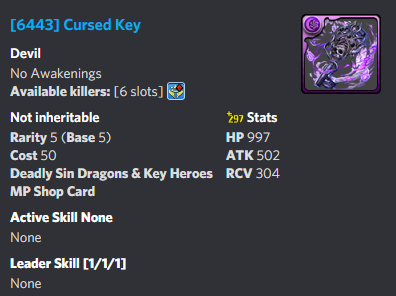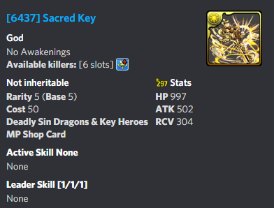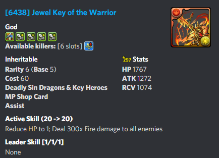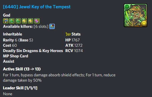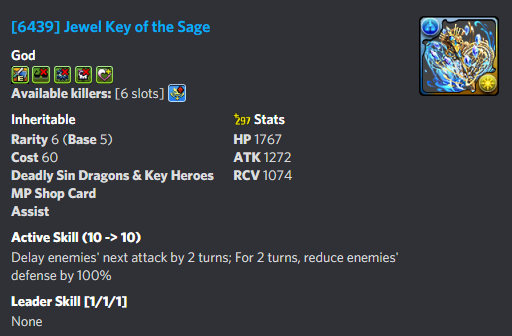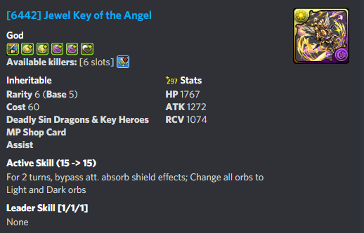 The awakenings of Blessed Key are heavily geared towards RCV, making it great on teams with naturally low RCV. However, although the active isn’t bad, it’s not very useful as a 3 turn bind and awoken skill bind clear is very lackluster nowadays. The 5 turn cooldown doesn’t help it in case you wanted to just use this for its awakenings.