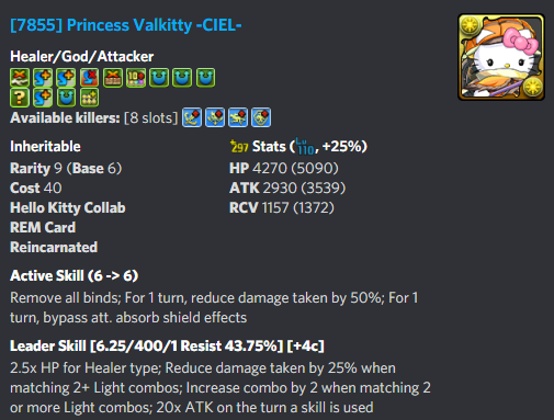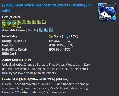 Okay, now we’re talking–for rainbow enthusiasts, Reeche Kitty is a card worth looking into. To me, this is one of the more noteworthy cards in the REM. Her leader skill is more competitive compared to Zela Kitty and Madoo Kitty; she’s got a nice 65% shield, 3 million auto follow up attack, and a color activation-based 22X damage multiplier. Reeche Kitty also has a fixed time leader clause of 13 seconds, which is reasonable for both 6×5 and 7×6 boards. If you like cushier orb move time for rainbow teams, this might feel daunting, however not having to deal with time debuffs is appealing. In terms of top of the line rainbow leaders, Beach Mariel and Story Mode Sakuya are currently dominant. Although Reeche Kitty is neither Dragon nor Attacker type, meaning she would not benefit from Beach Mariel’s HP multiplier, she still looks to be a fun pairing. Sadly, I still think Story Mode Sakuya is a better pairing for Beach Mariel, as she provides more shield, more attack, and pumps out twice as much auto FUA damage, albeit with a slightly stricter damage activation clause; Reeche Kitty only requires four colors to be matched, while Story Mode Sakuya requires Fire, Water, Wood, and Light specifically. That being said, Reeche Kitty looks like a fun and useful sub for rainbow teams because of her active skill. Board unlock, five attribute + heart board change, and nullification of attribute and damage absorb for 1 turn on a 9-turn cool down seems handy, especially in dungeons where only one turn is needed like Alt Shura Realm 1. End game dungeons like Shura 3 and Mysterious Dimension 1 require multiple turns of absorb nullification, however, so that’s something to keep in mind if you’re thinking of slotting Reeche Kitty into any of your end game dungeon builds–you may need to overwrite her skill by putting a Reeche Hat equip on your Reeche Kitty. She’ll be both powerful and fashionable!