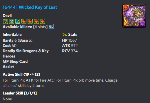 Lust Key takes the same active as the Lust line, but with significantly more useful awakenings. The 1000 decrease on ATK on whoever Lust Key is inherited on can be impactful, but you can easily just inherit it on someone who isn’t one of the primary damage dealers. The SB and rows combination allows Lust Key to be used on traditional Fire row teams and Fire row farming teams.