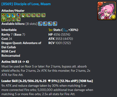 His use case is very similar to something like Dark Athena’s new evo (8448) giving you your rainbow team RCV buff active, just with less utility in the earlier parts of a dungeon. The main differentiator between Dai and Raffine is that Dai is a low cool-down, non-transforming rainbow leader. Meaning that unlike Raffine who requires the use of Todo, or some insane stalling tactics in the early dungeon, he is lead swappable right from the start of a dungeon, no stalling required or Todo required.