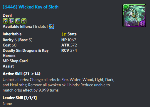 Sloth Key takes the same great active from the Sloth line, but at the cost of a 2500 decrease in HP and 2000 decrease in RCV, gives you a guard break awakening. Although a guard break equip is extremely rare (the only other card in the game that has a guard break and it an equip is Dyer’s Story Equip[7116]), it’s honestly not worth the stat decreases. Sloth Key will find more value in ranking where there is an emphasis on the guard break awakening. Although some traditional rainbow teams could need a guard break awakening, this is extremely niche and you’re almost always better off using a sub that has it.